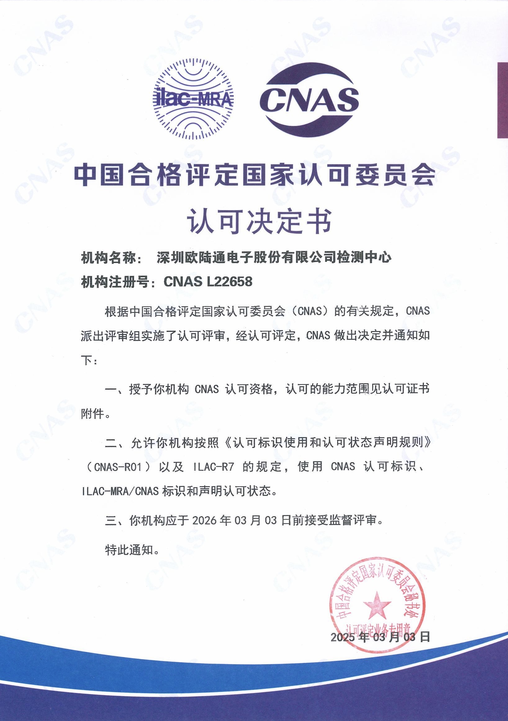 近日,歐陸通實驗室順利通過了中國合格評定國家認可委員會(CNAS)資質評審及合格評定,榮獲國家級CNAS實驗室認可證書,標志著公司實驗室的測試能力與管理體系已達到國際互認水平,檢測報告和結果可實現在全球上百個國家和地區(qū)的互信認可。